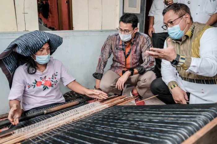 DAIRI, ITN- Menteri Pariwisata dan Ekonomi Kreatif/Kepala Badan Pariwisata dan Ekonomi Kreatif Sandiaga Salahuddin Uno mendorong para pengrajin ulos di Kampung Ulos di Desa Silalahi, Silahisabungan, Dairi, Sumatera Utara, terus berinovasi untuk meningkatkan produksi.