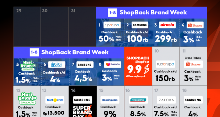 Selain fitur baru di atas, pada ShopBack ShopFest tahun ini, ShopBack memberikan promo Cashback hingga 99% serta beragam promo lainnya yang berbeda di setiap bulannya.Catat kalender promo dari ShopBack ShopFest bulan ini!.